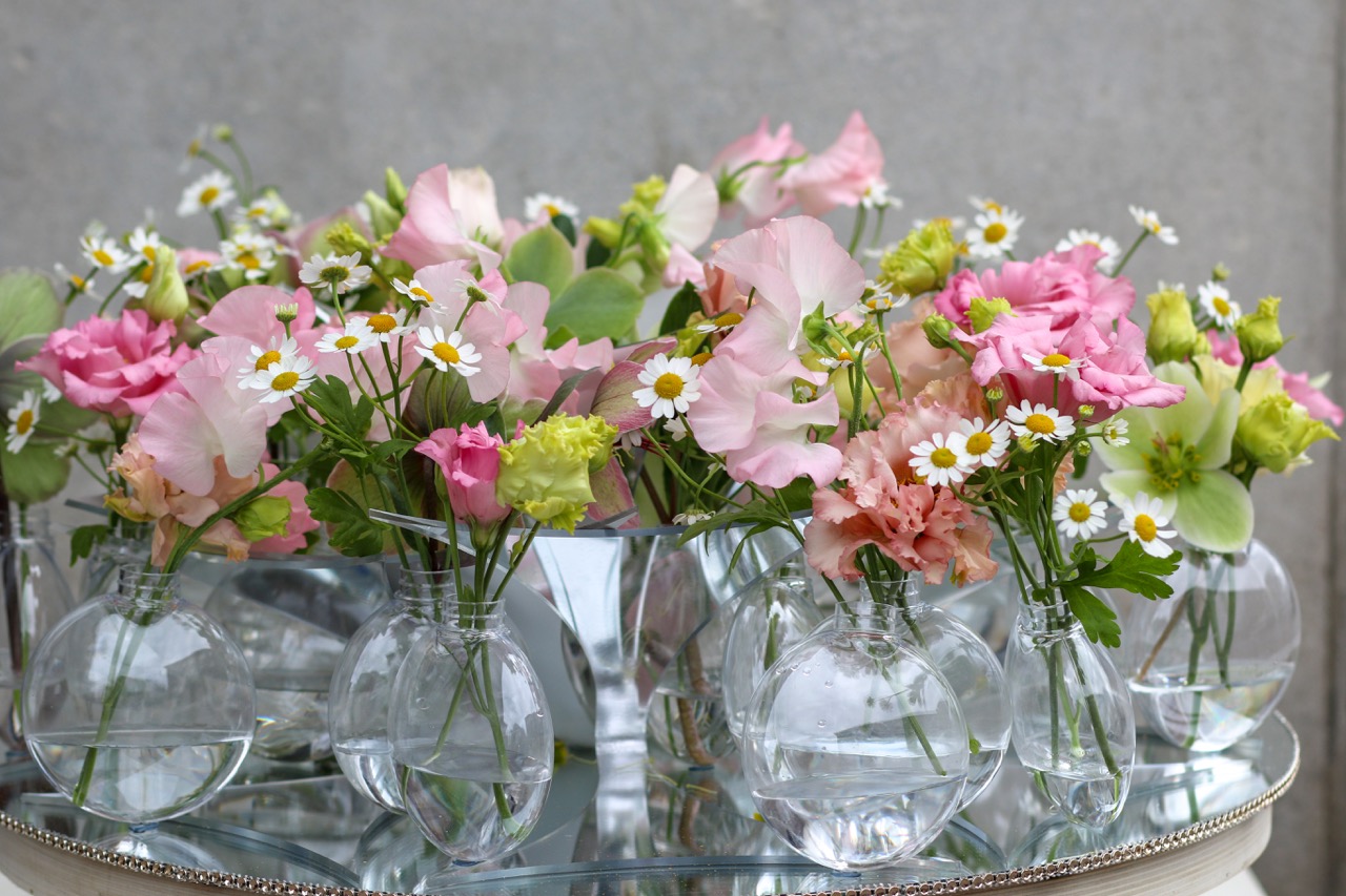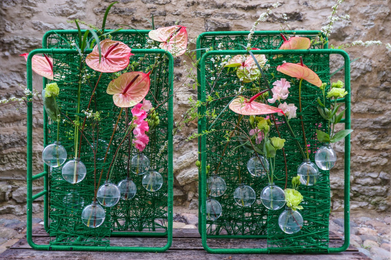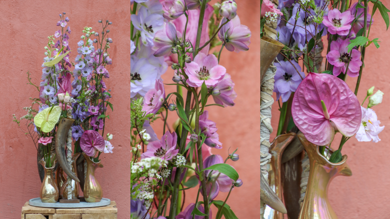 In this bold and unexpected design, Ahti built the composition on a reusable base, securing vases with painter’s tape and hot glue so everything can be dismantled and used again. Mixing garden finds like spirea with delphinium, anthuriums, and lisianthus, he creates a balance between raw structure and soft, spring elegance.