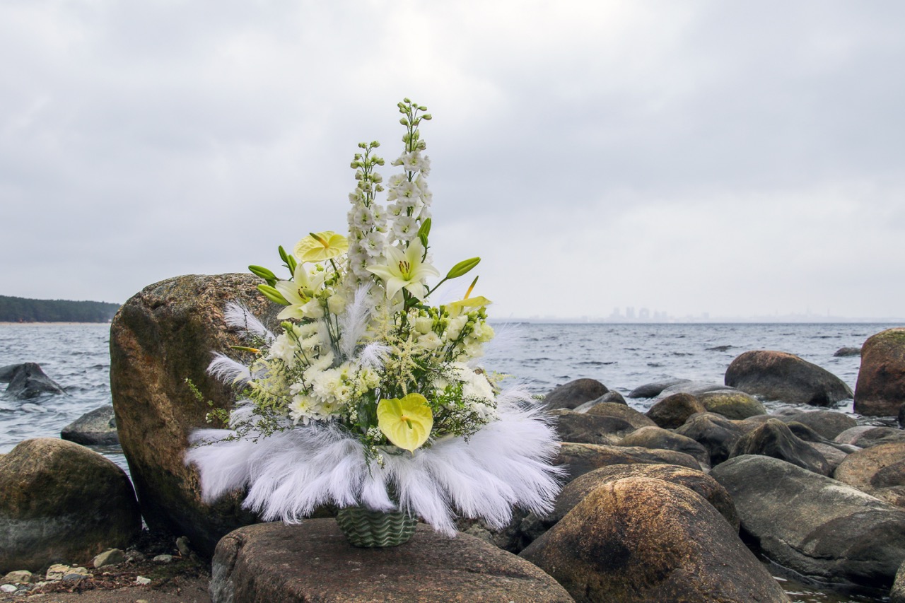By combining strong, long-lasting blooms like Baltica chrysanthemum and lilies with simple water tubes, he keeps the design both practical and striking.