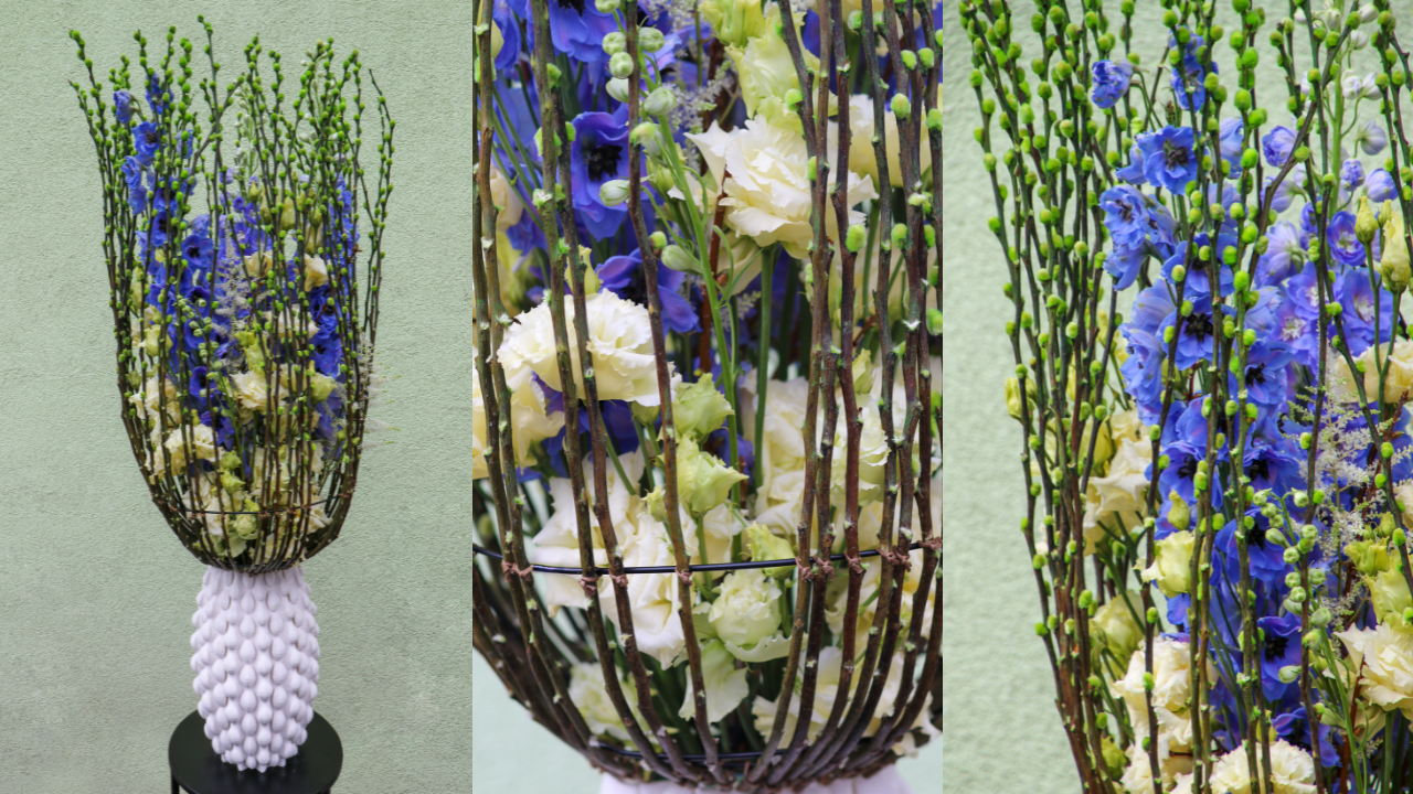 Ahti builds a flexible hand-tied framework using green willow shaped into a loose spiral structure, reinforced with simple connecting points that keep the form stable yet adjustable. He also incorporates repurposed materials, such as an old basket frame, showing how discarded elements can be reshaped into functional floral mechanics.