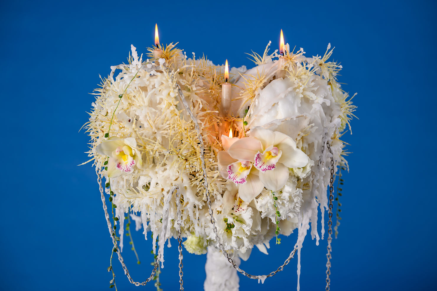 This was dramatic! A heart shape covered in wax with candles. Sharp cactus spikes around it. Soft white Lisianthus and mini Cymbidium orchids to balance the design. “Sometimes the purest thing can look dangerous, but maybe it isn’t,” Claudia said. Just like a real heart!